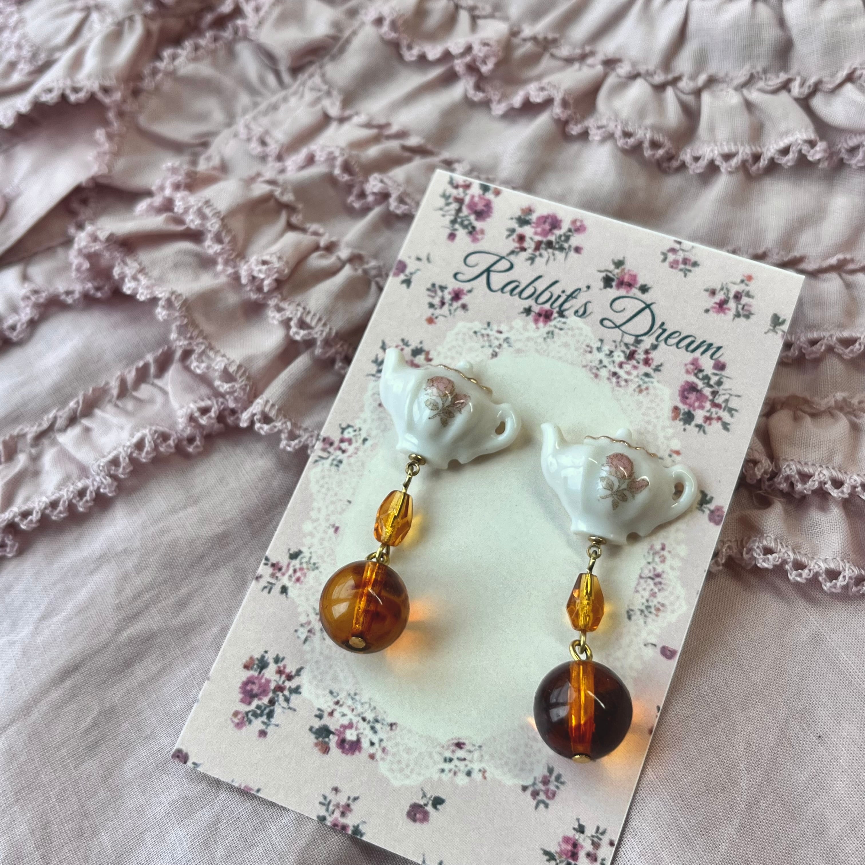 Rabbit’s Dreamオリジナルモチーフのティーポットに、ヴィンテージビーズを合わせた耳飾りです。